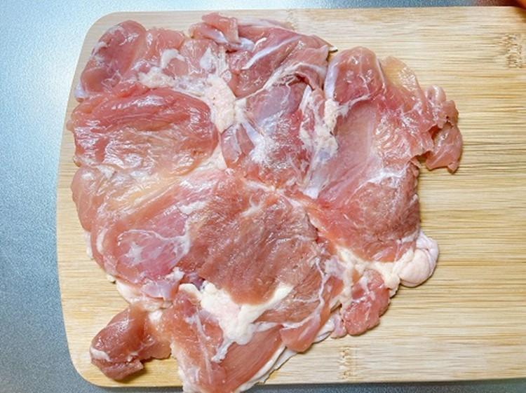 鶏もも肉を麺棒や重たいもので叩いてのばす。軽く塩コショウを振る。
