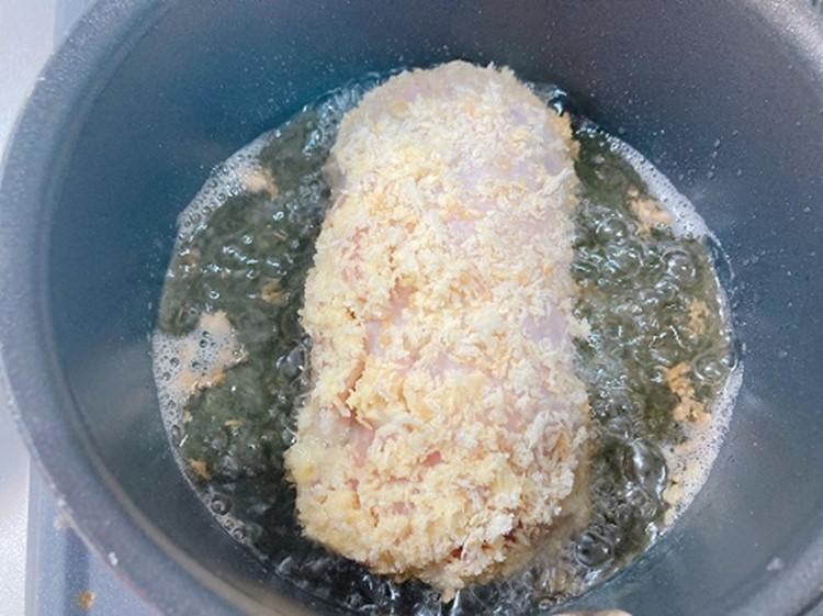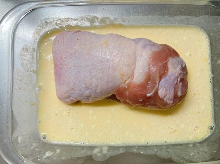 小麦粉と卵と大さじ2の水を混ぜ、バッター液をつくる。鶏肉をいれ、全体にバッター液をかけ、パン粉をまぶす。