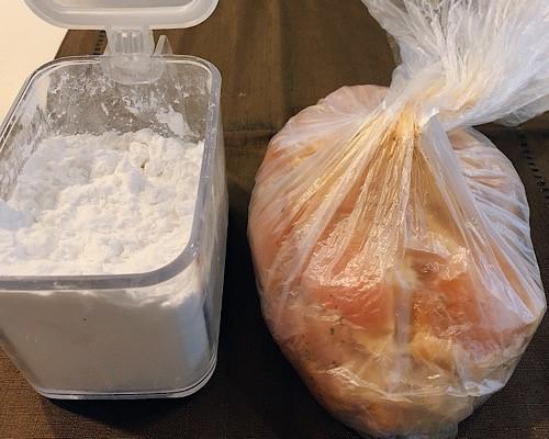 鶏むね肉を一口大にカットしてビニール袋などにいれて、酒と酢を加えてしっかりと揉み込む。冷蔵庫に入れ、30分以上おいておく。