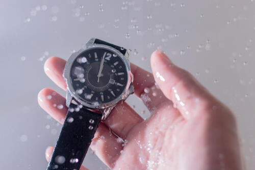 腕時計は精密機械で水に弱いため、普段からつける機会が多い人は防水性能もチェックしておくと安心だ。防水機能は「○気圧防水」「○m防水」と記載されているので、ライフスタイルに合わせて選ぶといいだろう。お手洗いで水がかかったり、外出時に雨に濡れたりする程度であれば、5気圧防水と表記されたものでOK。一方で、スキューバダイビングなどの水上スポーツをすることが多い人は、潜水用に使われる100気圧防水のダイバーズウォッチがおすすめだ。