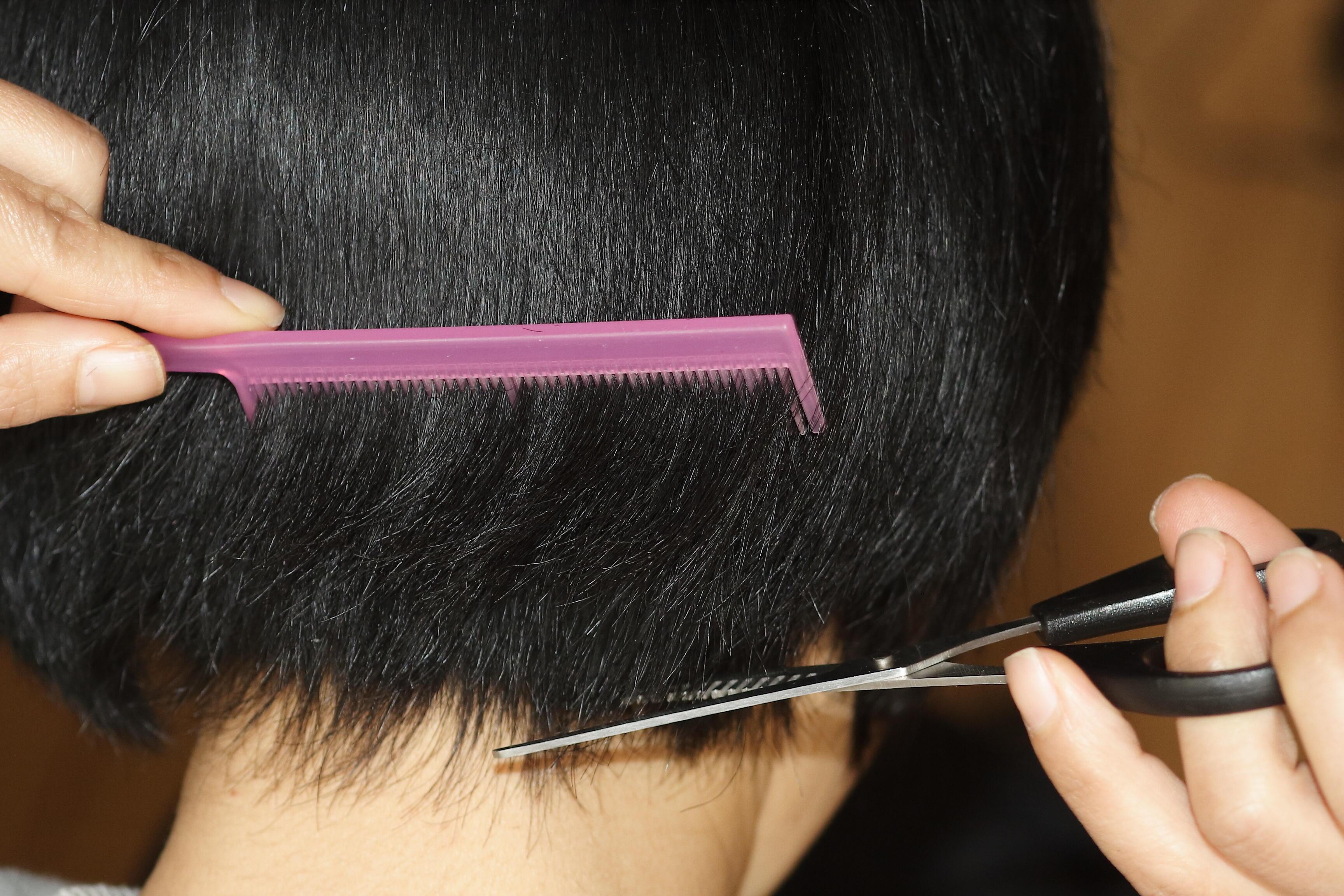 - 後頭部は手を後ろにまわして指を5本を差し入れ、髪を引き出しながら指に沿って切る
