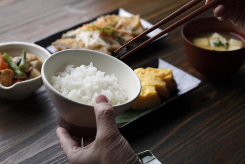 睡眠中に体内の栄養は使われているため、朝は体内の栄養が足りていない状態にある。そのため、米やパンなどの炭水化物をはじめ、野菜類や肉類・魚類もしっかりと食べるのがポイントだが。また、満腹感を高めるなら食物繊維が豊富なキノコ類を食べるのもよい。「炭水化物+おかず」で栄養バランスを整えるといいだろう。