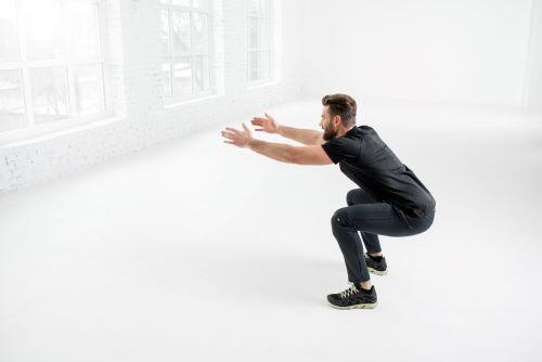 ダンベルやバーベルなどの道具を持たずに行う筋トレを自重トレーニングという。自重でフルスクワットを行う場合は、以下のフォーム・やり方を意識するとよいだろう。