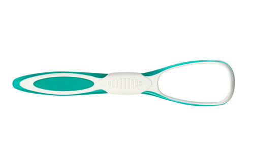シリコンやゴム製が多く、刺激の少ないヘラで舌表面の汚れをそぎ落とす。舌へのダメージは比較的少なく、舌磨きの初心者でも扱いやすい道具である。 - スクレーパータイプ