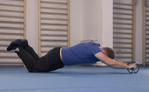 - 膝を軽く曲げて前屈しつつ腹筋ローラーを床につける