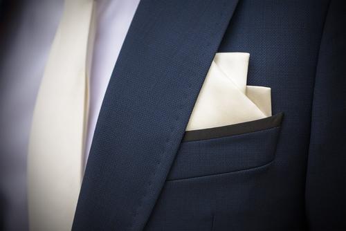 ポケットチーフは、いまや結婚式でのメンズのスーツスタイルに欠かせないものとなっている。フォーマルシーンでは、白のポケットチーフを使うのが基本的なしきたりだ。これは、ポケットチーフの歴史の中で、富裕層の紳士たちがコートや燕尾服にリネン素材の白のチーフを用いていたことから受け継がれたとされている。