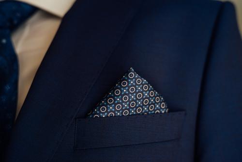 柄物のポケットチーフを選ぶ場合は、メンズスーツに合うシックなものを選び、折り方も工夫して全体のバランスを取るとよいだろう。ドット柄やストライプ柄などは取り入れやすいかもしれない。
