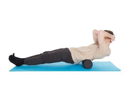 - 仰向けに寝転び、背中から腰に沿ってフォームローラーを転がせるように肩甲骨の下あたりにセットする。