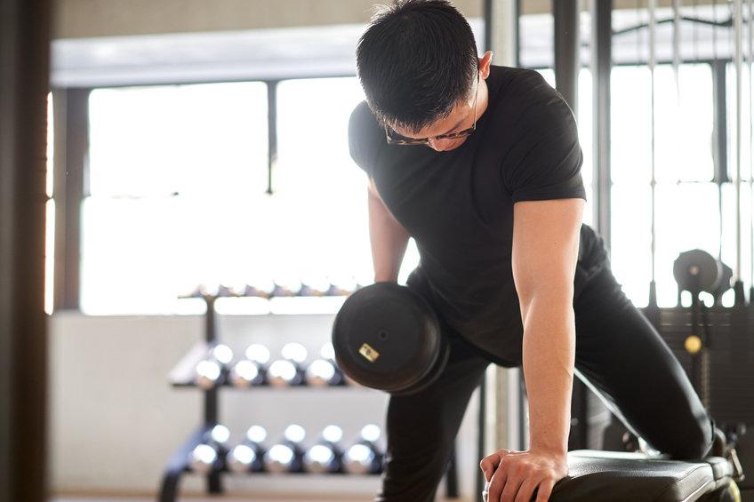 ダンベルを落として体にぶつけたり、ダンベルの重さに負けて関節を痛めたりすることも考えられる。必要に応じてエルボーサポーターやリストラップを装着し、関節を保護しながら鍛えていこう。
