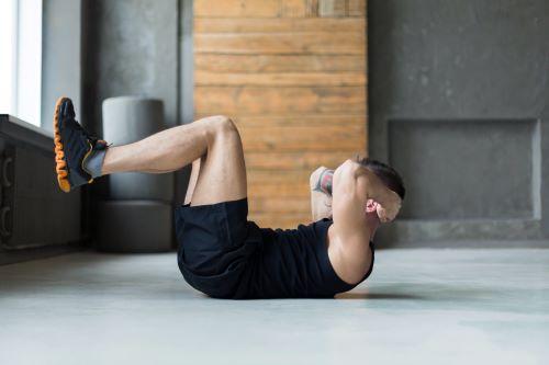足を上げるのは、踏ん張りを効かなくさせることでほかの筋肉を関与させずにダイレクトで腹筋を鍛えられるからである。ほかにも、より腹筋に効かせるポイントとして、顎を引き、背中を丸めることを意識して行うといいだろう。