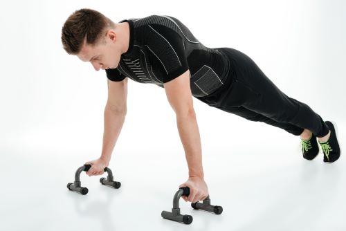 腕立て伏せで使える器具には、プッシュアップバーや腹筋ローラーなどがある。プッシュアップバーという器具を使って腕立て伏せを行うと、より深く沈み込まないといけなくなる。肩関節や肘関節の可動域が広くなり、より広範囲にわたって筋肉を使わなければならないのだ。したがって、より筋トレ効果が高くなる。また、通常の腕立て伏せでは手首に負荷がかかって痛みがでることもしばしばある。しかし、プッシュアップバーならガッチリ握って腕立て伏せができるので、手首が安定してケガの予防にもなるのだ。