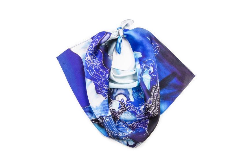 - まず、スカーフをバイアス折りにしていこう。スカーフを机に置き、上と下の角を中央であわせるように折る。
