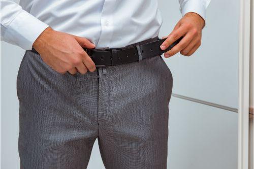 股上浅めのスラックスは、下腹部やお尻がスッキリとして見える。さらに、腹部が圧迫されにくく、長時間座っていても苦しくなりにくいのもメリットだ。