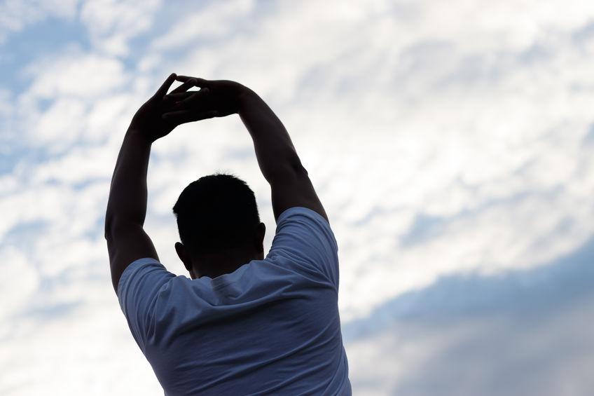 - 足を肩幅まで開き、手のひらを裏返すように両手を上にあげて背伸びをする。
