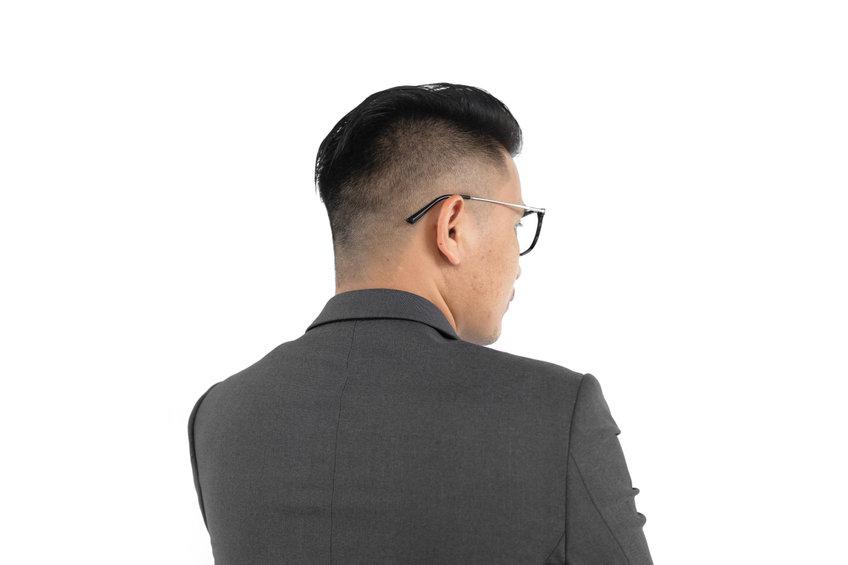 スクエア型に似合うのはサイドツーブロック、前髪6:4のスタイルだ。サイドのツーブロックは6mm程度にすることで、ビジネス・カジュアルどちらにも対応したスタイルを演出できる。スクエア型の直線的なフレームと眉ラインに沿うように、前髪を軽く流すことで、メガネのデザインを最大限に生かしたツーブロックに仕上がるだろう。