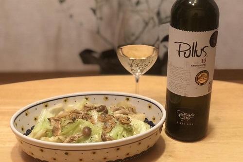 今回はプルス ソーヴィニヨンのフレッシュな酸味に合わせて、キャベツとアサリの白ワイン蒸しをペアリングした。
