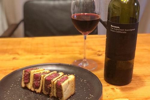 今回はBecause,I'm Cabernet sauvignon from Californiaの濃厚でしっかりとした味わいの飲み口にあわせて、ステーキサンドをペアリングした。