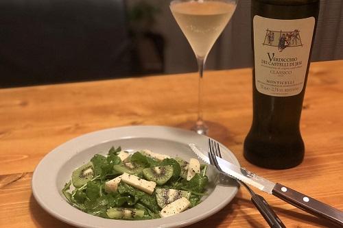 今回はヴェルディッキオ ディ カステッリ ディ イェージ クラシコのさっぱりとした飲み口とほのかな苦味に合わせて、ルッコラとキウイフルーツ、カマンベールチーズを使ったフルーツサラダをペアリング。